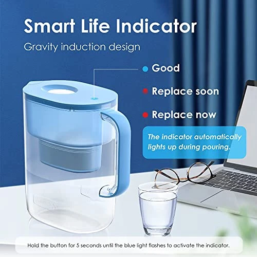 - [Intelligent Indicator]: Our Intelligent design of the water filter pitcher ensures a healthier and hassle-free life for users, as you can monitor water quality at any time. Thanks to the replaceable intelligent indicator which can sense when water is being poured, you can now see the usage state of the filter element based on the display mode of the LED (light-emitting diode) in real time.
