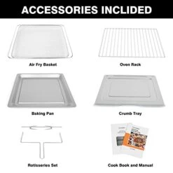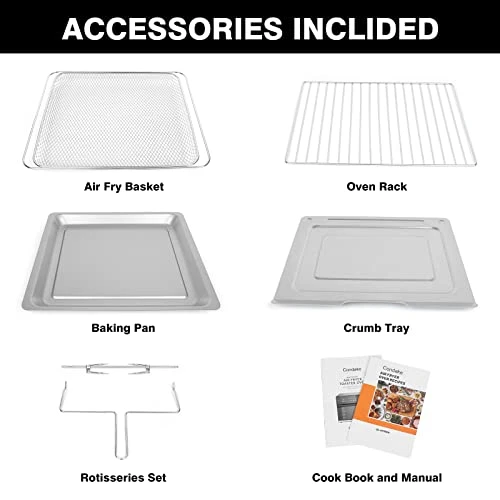 - 【Practial Accessories】Condake digital air fryer oven is equipped with many components, including 1 baking pan,1 oven rack,1 air frying basket,1 barbecue fork,1 pickup clip,1 bread crumb tray,1 manual and 1 recipe.