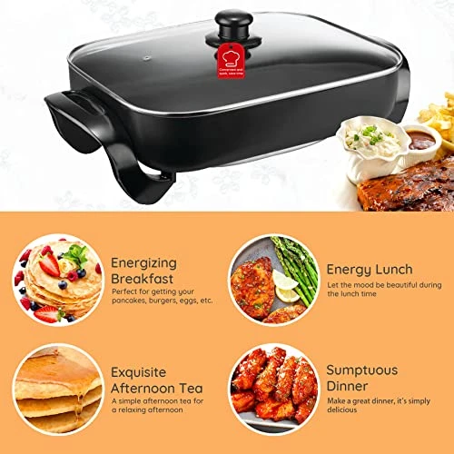 - High-quality material: our electric skillets is an excellent product, because it has good thermal conductivity, corrosion resistance and wear resistance, the surface is not sticky. the coating is also PTFE and PFOA free, ensuring a healthy and ecofriendly cooking experience.
