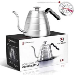 The handy silver Brewello Pour-Over Coffee Kettle has a generous 40-ounce (1.2L) capacity. Beautifully designed, with a reliable gooseneck spout and stay-cool, good grip handle, you can effortlessly and safely control the pour. It features a built-in thermometer for accurate temperature control (195-205F) and a unique, rust-free triple layer base. This superior bottom makes the kettle extra durable and suitable for use on all stoves, burners, and ranges: Gas, electric, induction, halogen, radiant, and camp stove. Because it is lightweight and easy to use with the dripper method, you can even take it camping, making the perfect pot of coffee a portable experience. A secure lid and securely welded spout stops leaks and water spilling out from the kettle while boiling (it’s recommended you only fill with 1 liter at a time to prevent boil-over). This ingenious design is made of high-quality 304 stainless steel which won’t rust or stain.