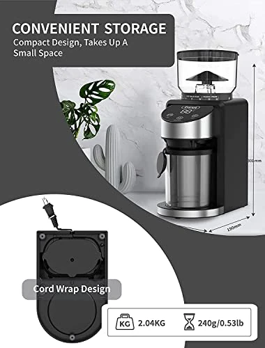 - ☕【Anti-static Technology 】This coffee grinder has built in anti-static technology that makes the coffee grounds chamber mess-free. With other brands when emptying the grind chamber of burr-style coffee grinders, ground coffee will often stick to the chamber and fly all over the counter. This coffee grinders elimination of static will not only improve your experience, but also make the most of every bean, and avoiding waste.