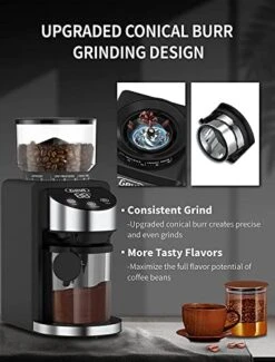 - ☕【Conical Burr & Uniform Grinding】The ground coffee made by the conical burr is more uniform than flat burr. This burr grinder ensures none of the beans essential oils are lost by way of oxidation, providing optimum coffee flavor.