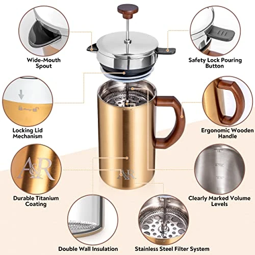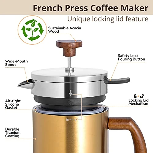- HOTTER FOR LONGER – This highly Durable French Press Coffee Set features double wall insulation, a lockable lid and a titanium coating, all designed to lock the heat in! The 1 liter/34oz Large French Press Camping size makes it the Best Coffee Press for Camping with friends