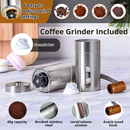- ALL-IN-ONE COFFEE CAMPING KIT- This French Coffee Press Set includes the Best Camping Coffee Press and Grinder with Acacia wood handles, a 1Tbsp coffee scoop/bag clip and a cleaning brush all in a beautiful vegan leather case with heaps of extra storage space.