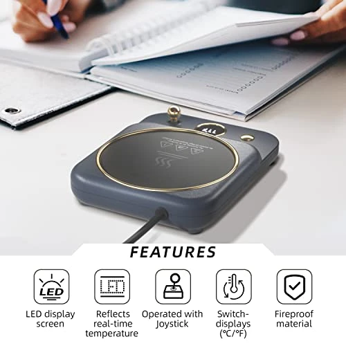 - Easy to operate:Beverage Cup Warmer has a unique joystick design,press joystick left: choose temperature,press joystick right: choose time,press joystick upward: choose temperature unit,M button: long press to switch on/off, short press to set,The Smart Coffee Warmer have a temperature LED display to show real-time temperature rise.