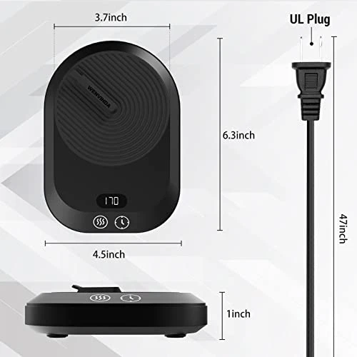 - Safe & Durable — The surface of the coffee mug warmer is covered with a layer of silicone pad, both beautiful and heat-resistant. The spill-proof design avoids damage and makes cleaning a breeze. The heating plate is 37 inches in diameter and fits most cups.