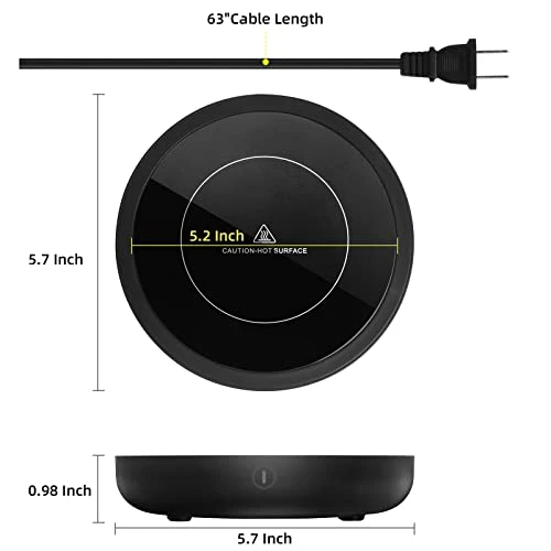 - High quality materials frame & Waterproof design with scratch-resistant tempered glass heating plate for added durability to make cleaning a breeze and avoid damage. Coffee mug warmer has a large 5.2 inch heating surface, your drinks can be at a deliciously warm temperature all the time.