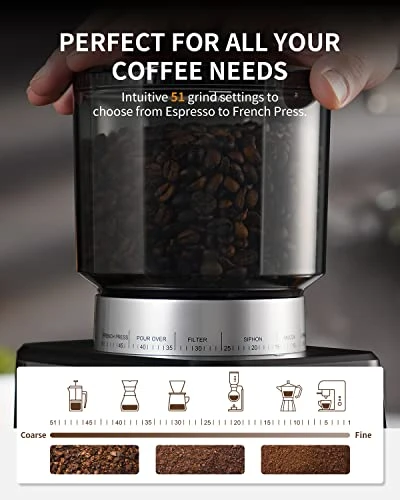 - [ Customizable Grind ] – 51 precise grind settings from the finest Espresso to the coarsest French Press Grind. Voltage: 110 120 Volts. Power: 165 Watts