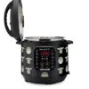 - Polished, brushed stainless steel exterior with black accents and plastic handles. Recipes included