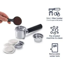 - ONE ESPRESSO SHOT OR TWO. The three-in-one filter holder, included with the unit, has filters for one espresso shot, two shots, and one for an easy-serve espresso pod – whatever your preference.