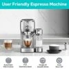 - USER FRIENDLY. A super-automatic espresso maker can deliver the coffee shop experience to the comfort of your home, any time you feel the urge. System equipped with a sensor metal touch control panel, a front-loading water tank, a frothing unit, a telescoping spigot, a bean hopper & coffee-grounds container with a capacity indicator and also provides adjustable water, milk & coffee drink quantity.