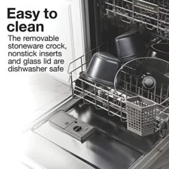 - EASY TO CLEAN: The removable stoneware crock, nonstick inserts and glass lid are dishwasher safe and easy to clean. The crock can also be used in the oven or microwave.