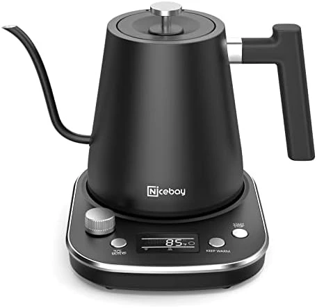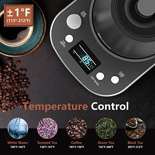 - 【1200W Fast Heating】The high power of 1200W makes the gooseneck kettle heat up quickly, and it only takes 3 to 5 minutes to boil a pot of 0.8L water. Greatly reduces the waiting time for brewing coffee or tea. After heating, you can set a desired temperature and press the keep warm button to keep warm. So you can get warm water to brew coffee or tea at any time.