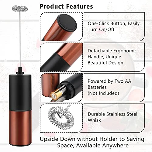- Easy to Use and Clean: The lightweight drink mixer with an ergonomically handle, one touch on/off. Our powerful and durable hand-held milk frother is powered by two AA batteries (not included).By the way, you can directly place the stirring head into the water without disassembling, and turn it on, the vortex flow will make the cleaning easier and more thorough, then dry by pushing the button again for 2-3 seconds.