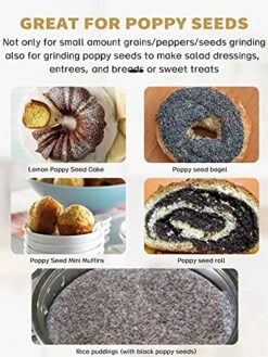 - APPLICATION & WARRANTY – Not only for small amount coarse grains/beans/coffee beans/peppers/seeds grinding, but also work well on grinding poppy seeds to make salad dressings, entrees, and breads or sweet treats. With ONE-YEAR WARRANTY, any questions or needs during use, email us for help.