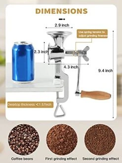 - SMALL SIZE FOR HOME SMALL AMOUNT GRINDING – 4.3inch x 9.4inch (LxH) grinder main body with a 2.9 inch (Dia) small hopper. This hand mill can only grind about 50g at a time, which is ideal for family kitchen or individual! Also, the beans or seeds ready for grinding should no bigger than the size of soybeans.