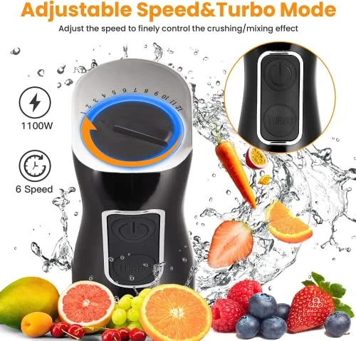- 【POWERFUL BLENDING EFFECT】:The emulsion handhold blender has 304 stainless steel blade, features 6-speed/turbo blending, flexible for handling different sorts of ingredients, with a all-copper motor from minimum 500W to maximum 1100W that has a notably low noise level, make food mixing more efficient, evenly and smoothly.