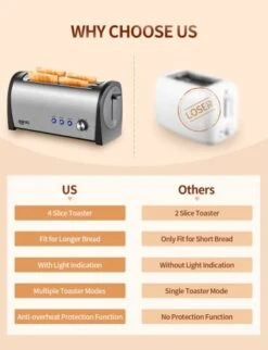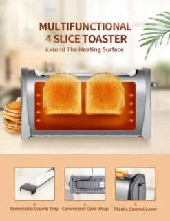 - 🎁【EASY TO CLEAN & STORAGE】The bottom of the toaster extra wide has a sliding-out crumb tray in which all the bread crumbs are collected (the tray can be washed directly). An Anti-sticking design guarantees the 4 slices long toaster can stop toasting automatically when time is finished. There is a storage space for the power cord at the bottom side, which is easy to store. We provide a 12 MONTH warranty and after-sales service. If you encounter problems, please feel free to contact us.