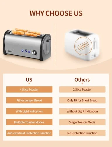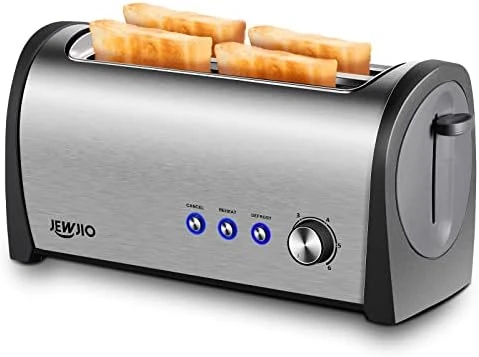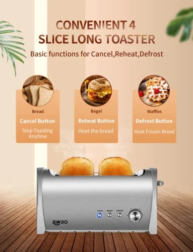 - 🎁【MULTIFUNCTIONAL 4 SLICE LONG TOASTER】 The wide slot toaster with DEFROST/ REHEAT/ CANCEL functions. ①DEFROST: Defrost refrigerated bread. ②REHEAT: Reheat bread without over-browning or burning it. ③CANCEL: Stop Toasting. NOTE: When the toaster is working, the outer surface will be very hot. Please do not touch the hot surface directly with your fingers or hands. (Tips: It is recommended to start the product at least 1 time without inserting a slice of bread before official use. )