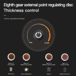 - Specialized design: The Pentagon conical burr, ideal for a variety of brewing methods. Excellence and consistency of performance, which make a clean and bright tasting. That is difficult to achieve with other grinders.Rotary grinding button, the large number is coarse coffee ground, the small number is fine coffee ground. More than 7 for French press, 5 to 7 for hand-brewed coffee, 3 to 5 for Hanging ear coffee, less than 3 for pressurized Italian coffee machine or mocha pot.