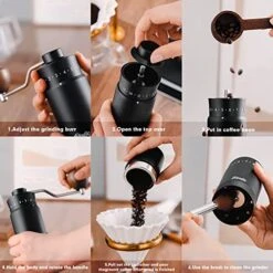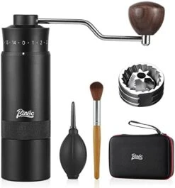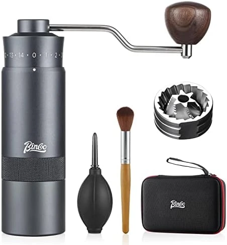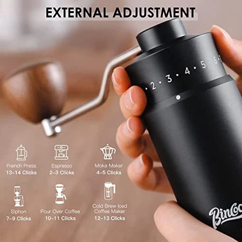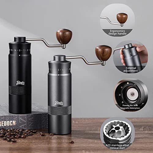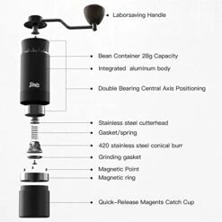 - 【Premium Design】Our conical burr coffee grinder is processed by 6-axis CNC,the body of grinder is all-metal. The one-piece aluminum body is sturdy and durable. The internal structure is stainless steel. Double bearing central axis positioning. The 420 stainless steel grinding core avoids the problem of easy fracture of the ceramic grinding core during the grinding process. The life is 5-6 times longer than ordinary grinding core. You can use it for many years without replacement.