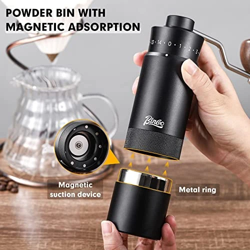 - 【Powder Bin With Magnetic Adsorption】Different from other traditional grinders, the powder bin has a unique magnetic suction design, strong sealing, and the powder bin can be taken out with one hand during use, which is more convenient and fast.