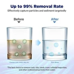 - 💧 PROTECT WATER EQUIPMENT: This filter removes up to 99% of sediment, including rusts, silt, sand, and other undissolved particulates from feedwater. As the first-stage filter in the whole house filtration system, it protects your post-filters, water appliances, pipes, bathroom, and kitchen faucets and shower fittings from clogging, providing a healthier filtered water supply for your home.