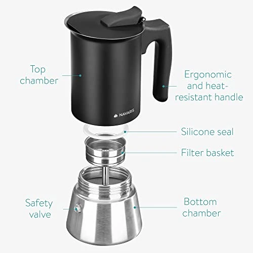 - STAINLESS STEEL: The stainless steel design of the stove top coffee pot ensures a durable and lost lasting coffee maker. Not dishwasher safe. Wash by hand.