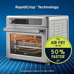 - FASTER, CRISPIER RESULTS: RapidCrisp Technology uses cyclonic air flow for superior air frying results, providing crispier results in up to 50% of the time; air frying uses 99.5% less oil compared to a 3.7L deep fryer As compared to Oster Air Fryer Oven model 2129751
