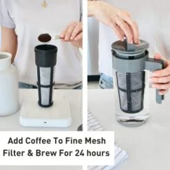 - The Fine-Mesh Coffee Filter in this cold brew coffee maker keeps grounds out of your freshly brewed pot – differing from other coffee machines. Tritan plastic withstands hot temperatures if you want a hot cup of coffee. Fits in most refrigerator doors