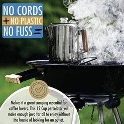 - ☕ NO CORDS + NO PLASTIC = NO FUSS – Makes it a great camping essential for coffee lovers. This 9 Cup percolator will make enough java for all to enjoy without the hassle of looking for an outlet. Made from solid stainless steel that can take drops and knocks whilst camping or while on vacation.