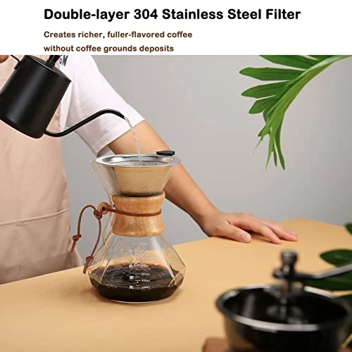 - ☕ STOVE SAFE AND DISHWASHER SAFE: Our pour over coffee pot is made of strong non-porous borosilicate glass, which can easily withstand high temperatures up to 150℃(300℉); for quick and easy cleaning, simply place the metal filter and coffee maker in dishwasher.