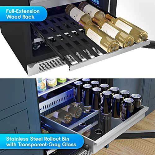 - 4 adjustable, transparent-gray glass shelves w/ airflow openings 1 full-extension stainless steel rollout bin 2 full-extension, black wood racks w/ stainless trim