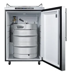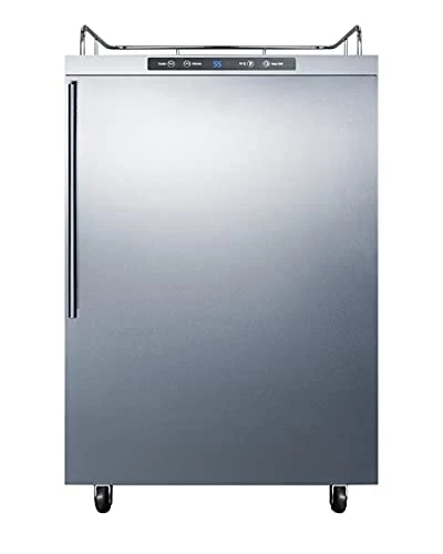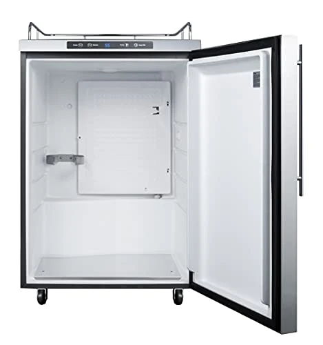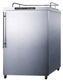 Summit Appliance offers a versatile line of fully featured weatherproof beer dispensers designed for freestanding use in the outdoors. The SBC635MOSNKHV is a full-sized beer dispenser that can hold a full half, quarter, 1/6, or mini keg. No tapping equipment is included, allowing ‘do-it-yourselfers’ to customize the unit. It features a 304 grade stainless steel wrapped cabinet, top, and door, with a sleek handle completing the look. The surface includes a removable drip tray to collect spills and a chrome guard rail to help keep glasses and mugs in place. We include a set of locking casters for easy mobility. An integrated ground fault circuit interrupter (GFCI) offers added safety. Automatic defrost operation ensures minimum user maintenance inside the 5.6 cu.ft. interior. A digital thermostat makes it easy to manage the temperature at the touch of a button. The external digital display shows the temperature in Celsius or Fahrenheit to ensure beer is stored exactly how you like it. The floor is reinforced with a steel cover for added durability when loading kegs. This unit is designed for freestanding use. Features: Model #: SBC635MOSNKHV. Brand: Summit Appliances. Weight: 150 Lbs. Meets UL guidelines. Thin 14mm diameter stainless steel handle. Casters ship unassembled: 2.5″H. Top guard rail ships unassembled. 100% CFC Free. US Electrical Safety: ETL. Canadian Electrical Safety: ETL-C. Specifications: Width with Door Open: 25.25″. Depth with door at 90 Degree : 47″. Capacity: 5.6 cu.ft. Defrost Type: Automatic. Door & Cabinet: Stainless Steel. Energy Usage/Year: 310.0kWh. Amps: 0.86. Voltage/Frequency: 115 V AC/60 Hz. Door Swing: RHD. Reversible: Factory Reversible. Thermostat Type: Digital. Refrigerant: R600a. Refrigerant Amount: 1.13 oz. High Side PSI: 250. Low Side PSI: 110. Wheel Qty: 4. Surface: Stainless Steel. Temperature Range: 33 to 50 Degree F. Interior Dimensions: 20.5″W x 19″D x 28″H. Overall Dimensions: 24″W x 25.88″D x 33.5″H.