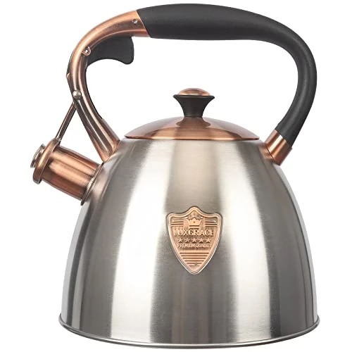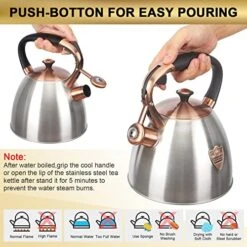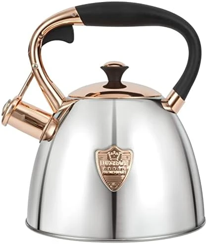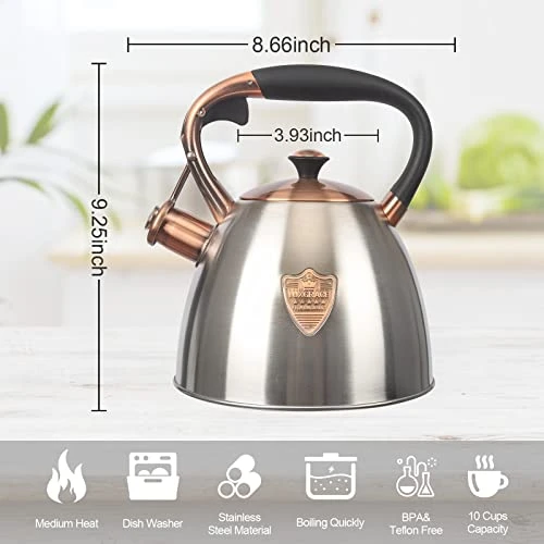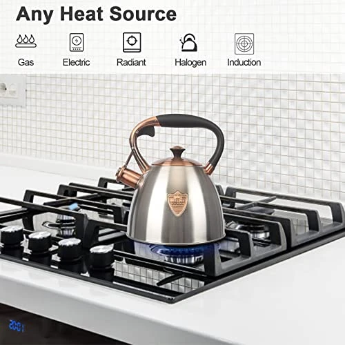 - 🎶Perfect Whistling Sound of Teakettle: This tea kettle for stovetop has a tight-fitting lid keeps steam in the hot tea kettle for rapid heating, and realse pleasant whistles sound when water reaches a boil, Loud enough to alarm you when you busy in the next room.