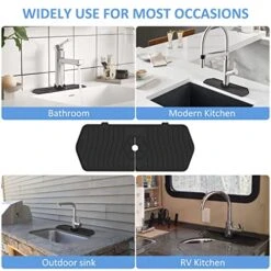 - 【Stylish Appearance】The shape of sink faucet splash guard can be well integrated into different usage scenarios and black luxurious color also elevates your home decoration. It’s easily fit around almost types of sink faucets in kitchens, bathrooms, RVs, cafes, restaurants to put any wet things and save your time to wipe countertop every day.